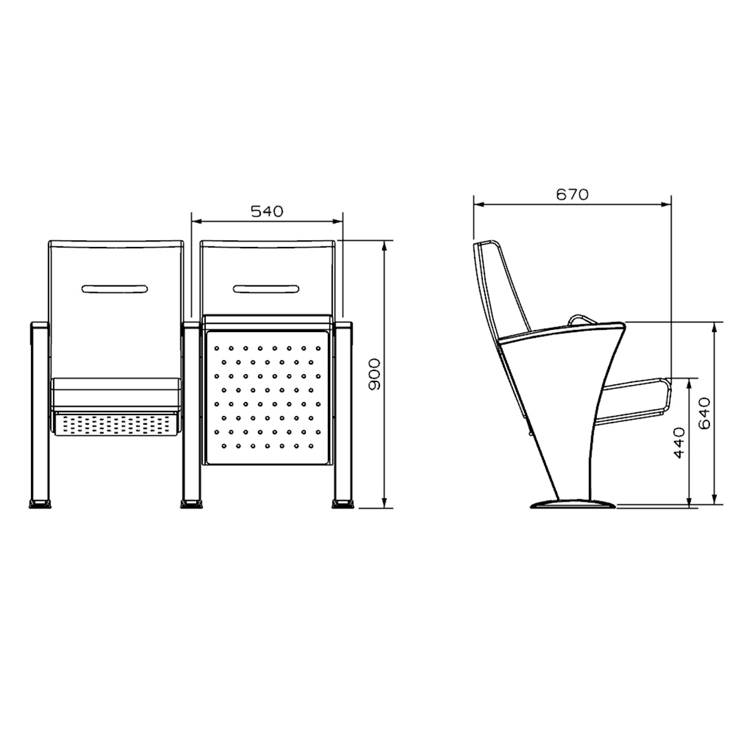 يتم تصنيع أجزاء توصيل القدم من مقطع 40x60x1,5 مم ويتم تصنيع أجزاء التوصيل بالأرضية من صفائح لا يقل سمكها عن 2 مم يتم تشكيلها وتشكيلها بواسطة قوالب. الإطار المعدني أسفل مسند الذراع مغطى بألواح MDF وقماش مصفح. يتم استخدام مساند الذراعين بين المقاعد المثبتة بشكل متسلسل بشكل شائع. يتم استخدام مساند الأذرع بين المقاعد بشكل مشترك ويتم تثبيت المقاعد على الأرض بقدمين.