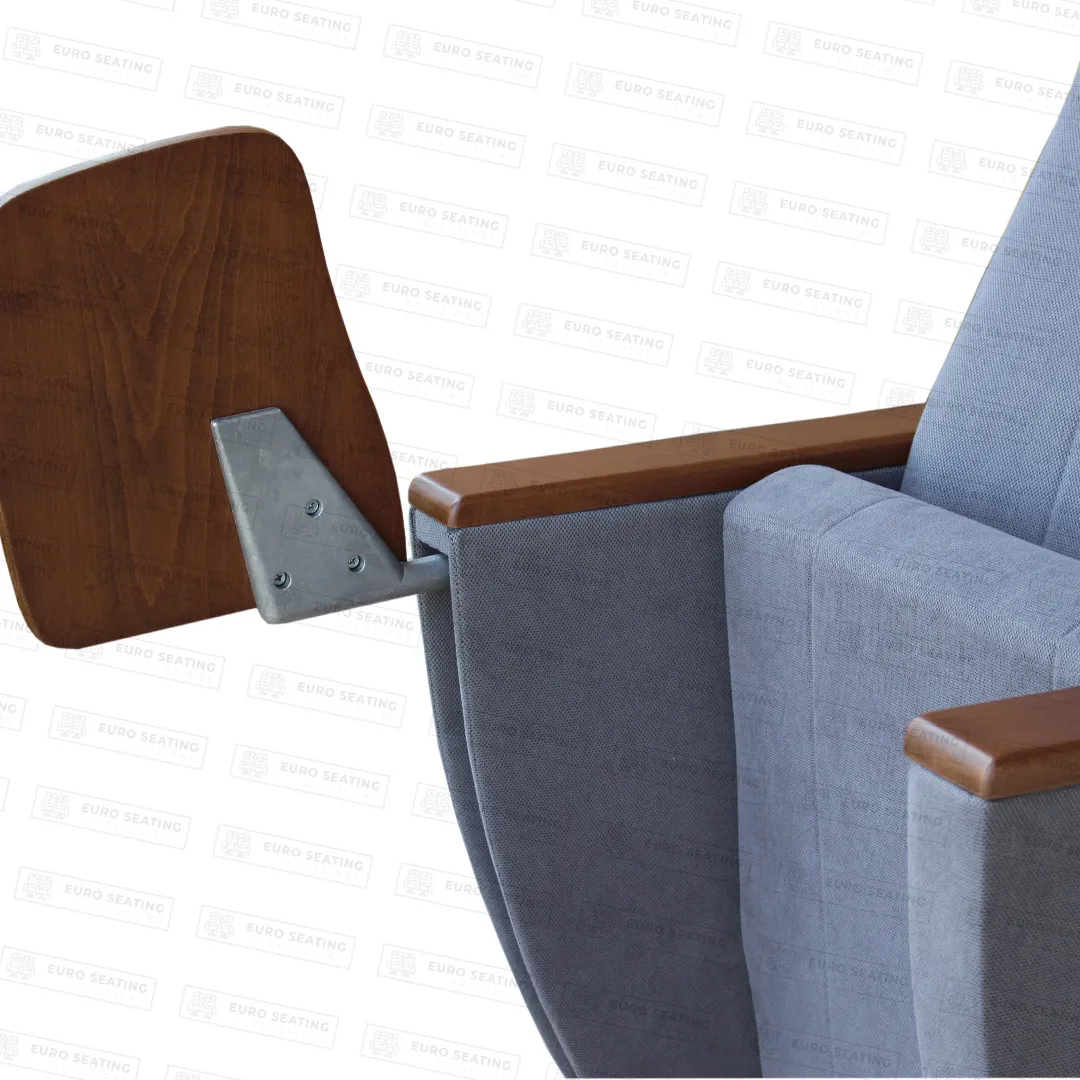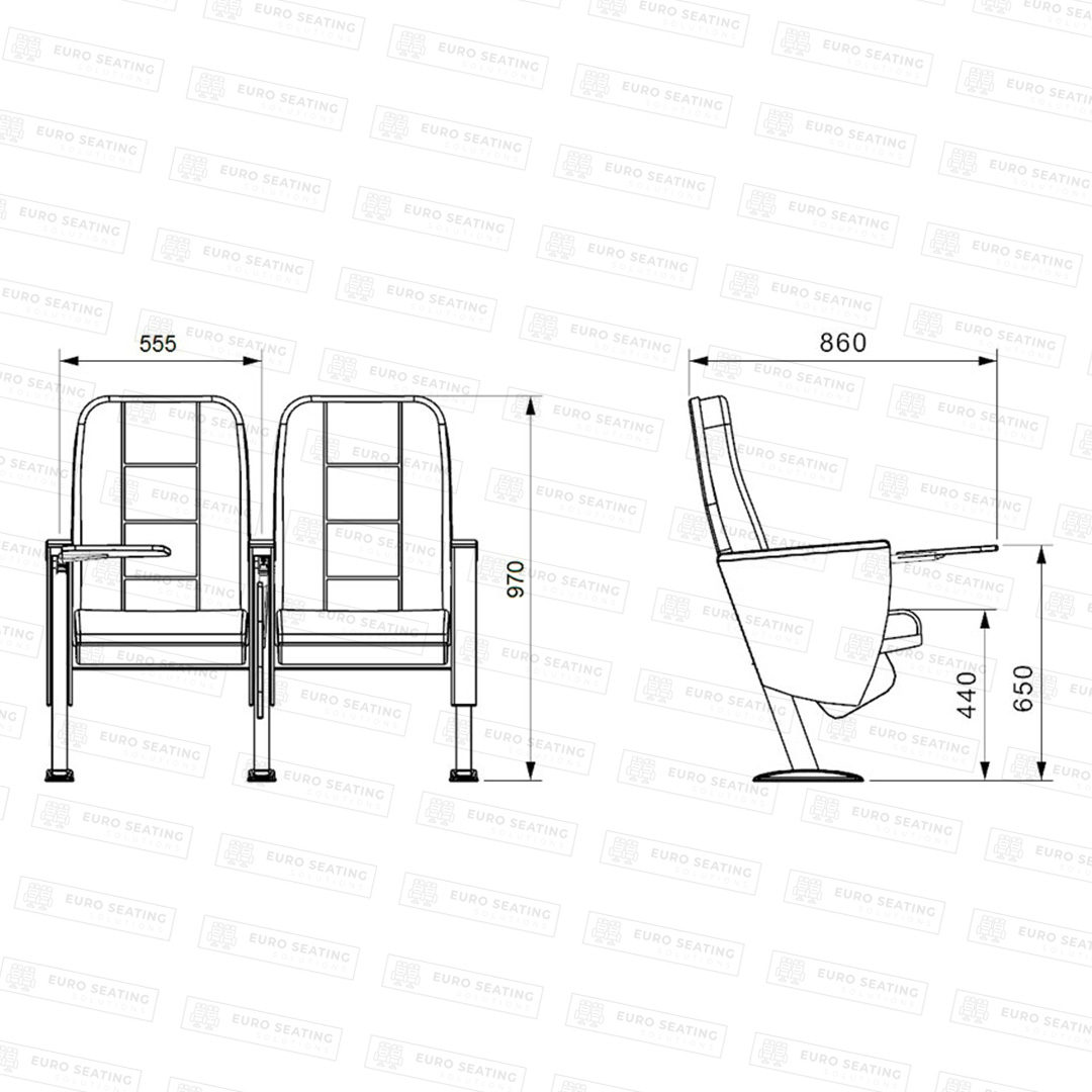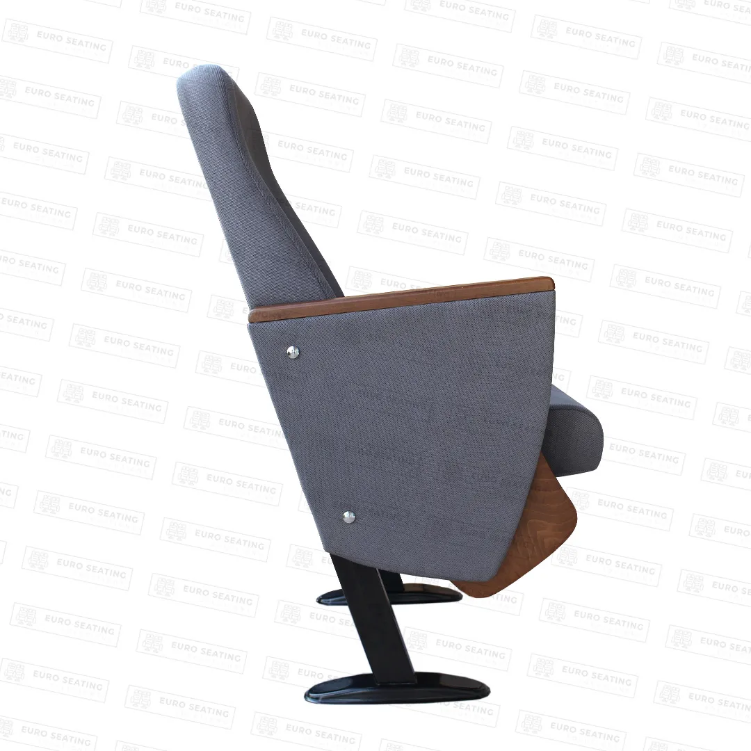 The foot connection parts are manufactured from 40x60x1,5mm profile and the connection parts to the floor are made of at least 2 mm sheet which is shaped and formed by molds. Metal frame under armrest are covered with mdf and laminated fabric. Wooden armrests and anti panic writing table are fix on the metal frame. Armrests between the seats are used as a common. The seats are fixed to the floor with double legs and suitable fasteners.