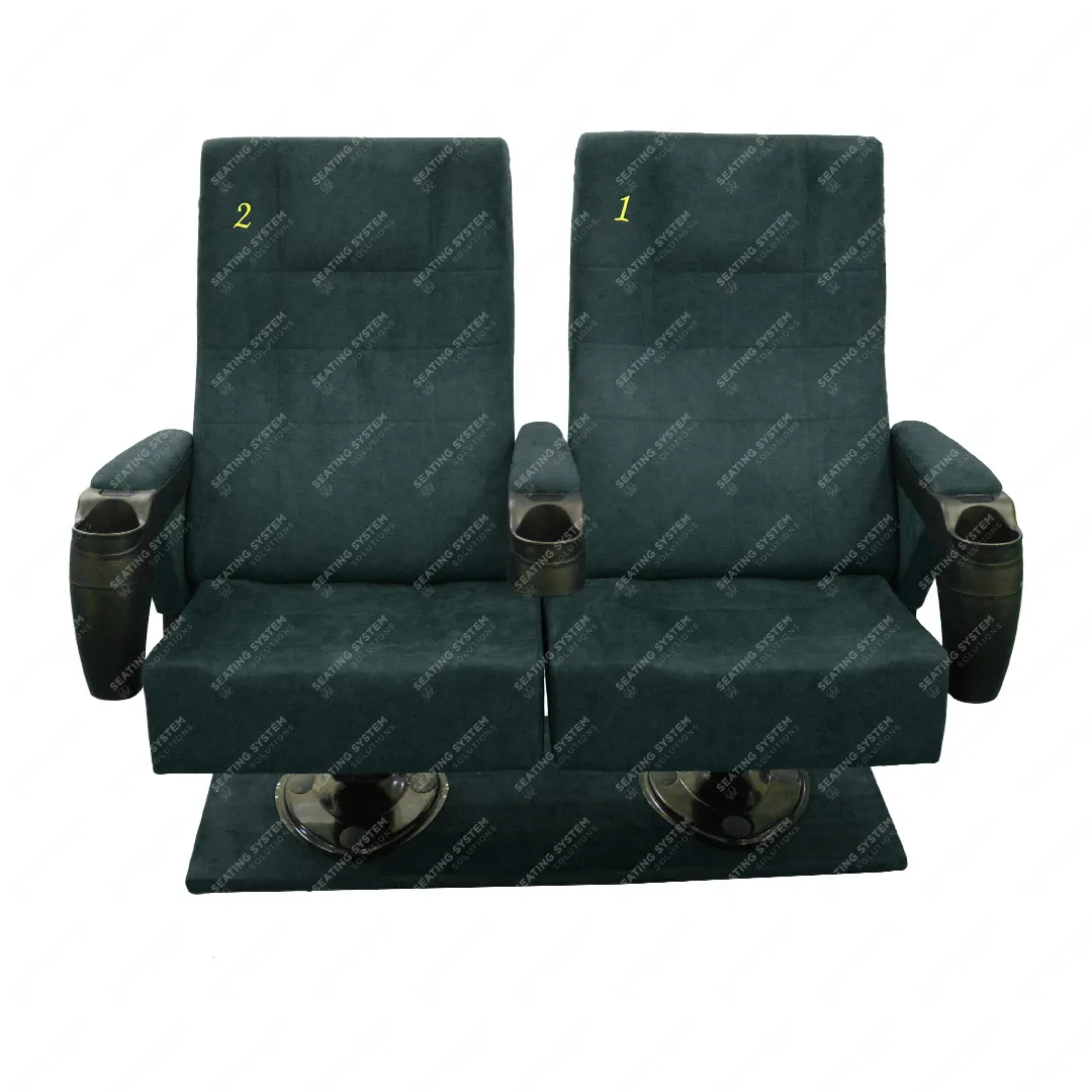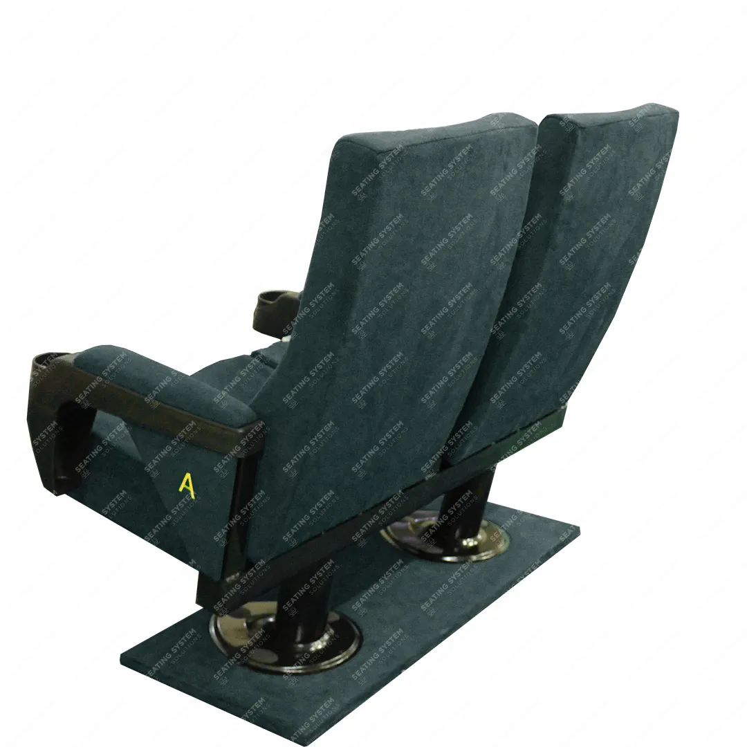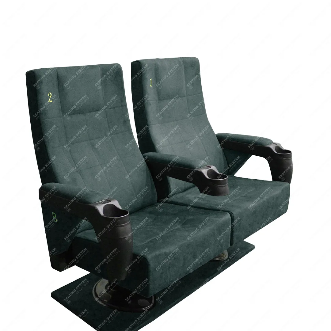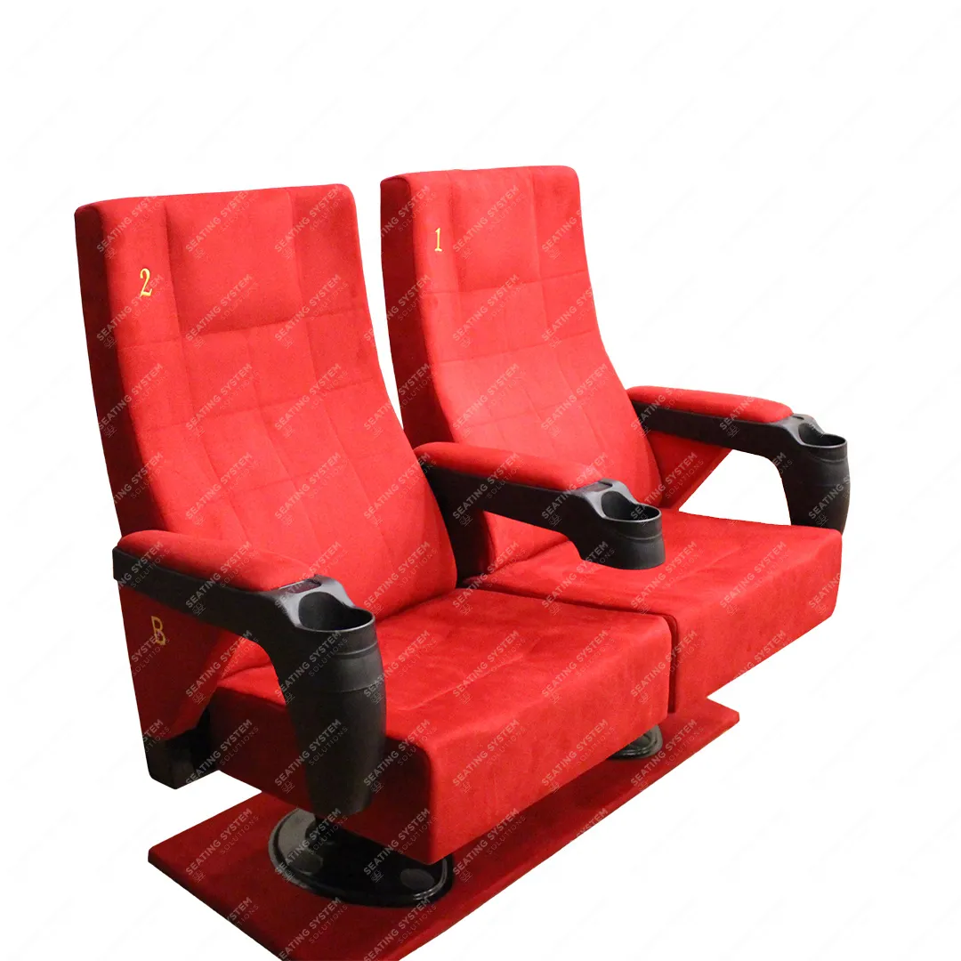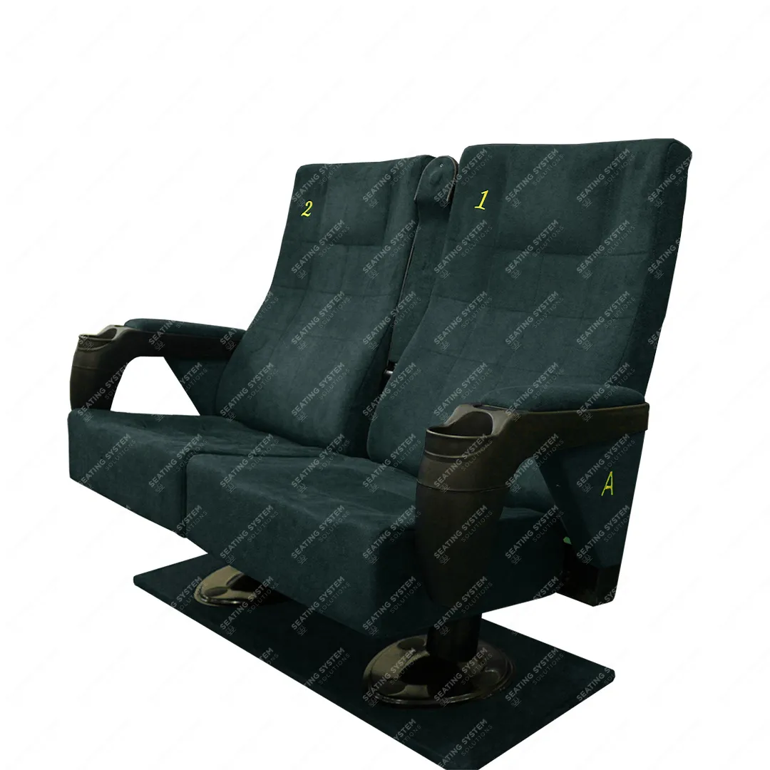 A cinema chair with a double fixed arm and movable middle arm, designed specifically for international cinemas, can be used in cinema halls and movie theaters. Vip Places Stadium & Sport Area.