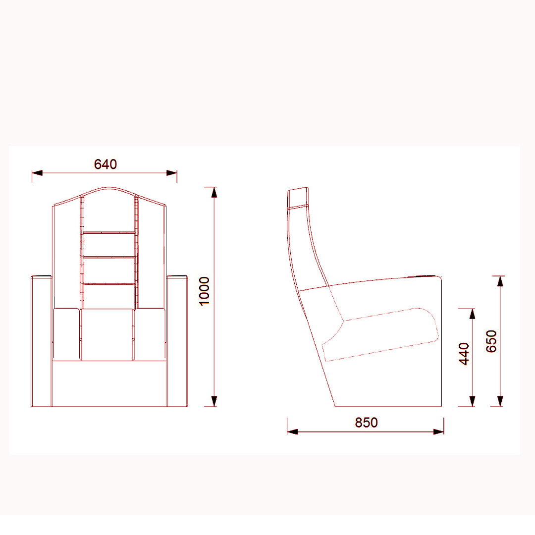 The foot connection parts are manufactured from pipe with a diameter of 100 mm and 2.5 mm thickness and the connection parts to the floor are made of at least 2 mm sheet which is shaped and formed by molds. Fabric covered MDF armrests are fix on the metal frame. Armrests will be fabric upholstered. Armrests between the seats are used as a common. Seats are fixed to the ground with single foot.
