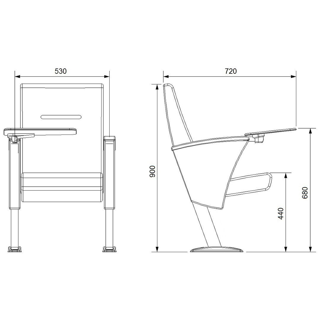 The foot connection parts are manufactured from 40x60x1,5mm profile and the connection parts to the floor are made of at least 2 mm sheet which is shaped and formed by molds. Metal frame under armrest are covered with mdf and laminated fabric. Wooden armrests and writing table are fix on the metal frame. Armrests between the seats are used as a common. The seats are fixed to the floor with double legs and suitable fasteners.