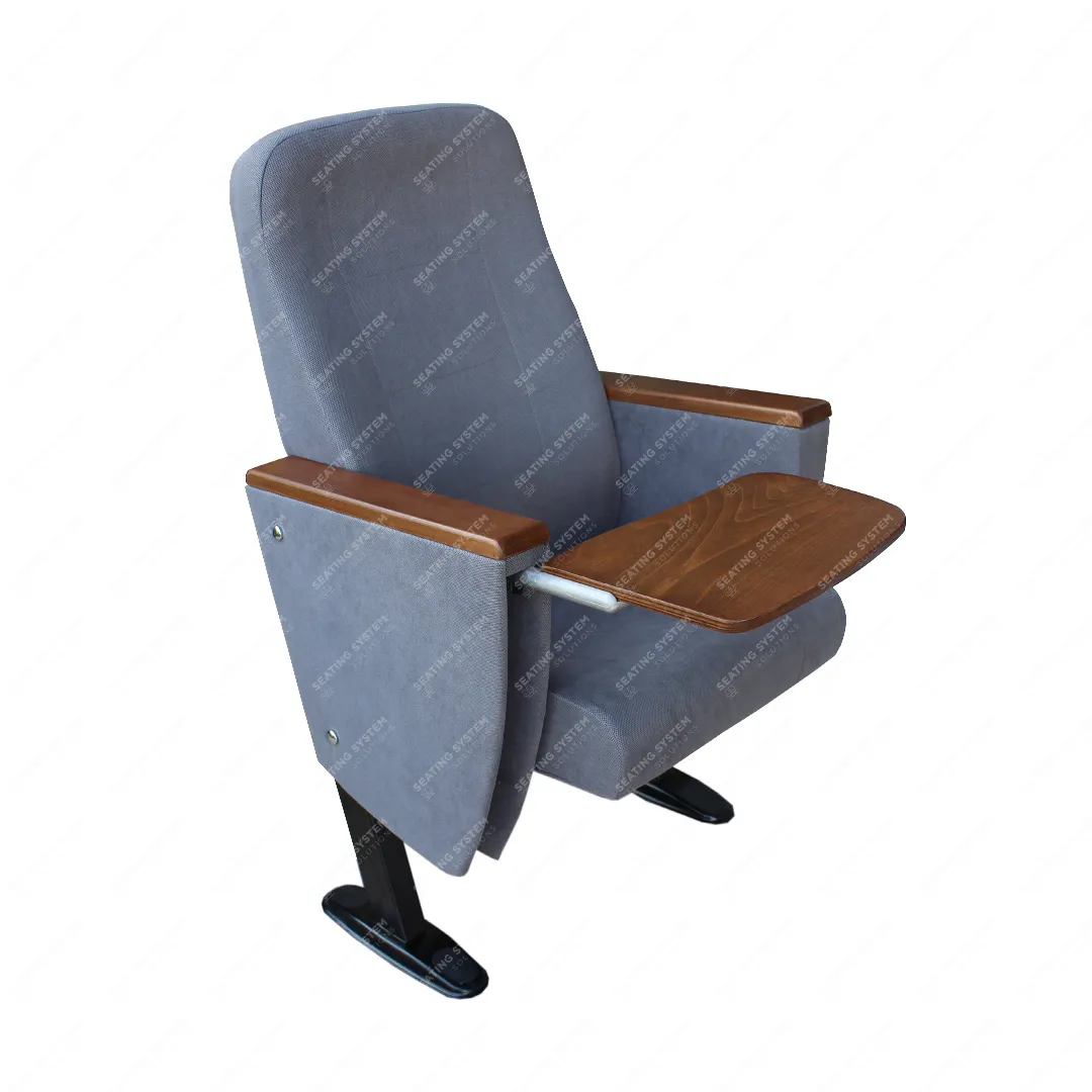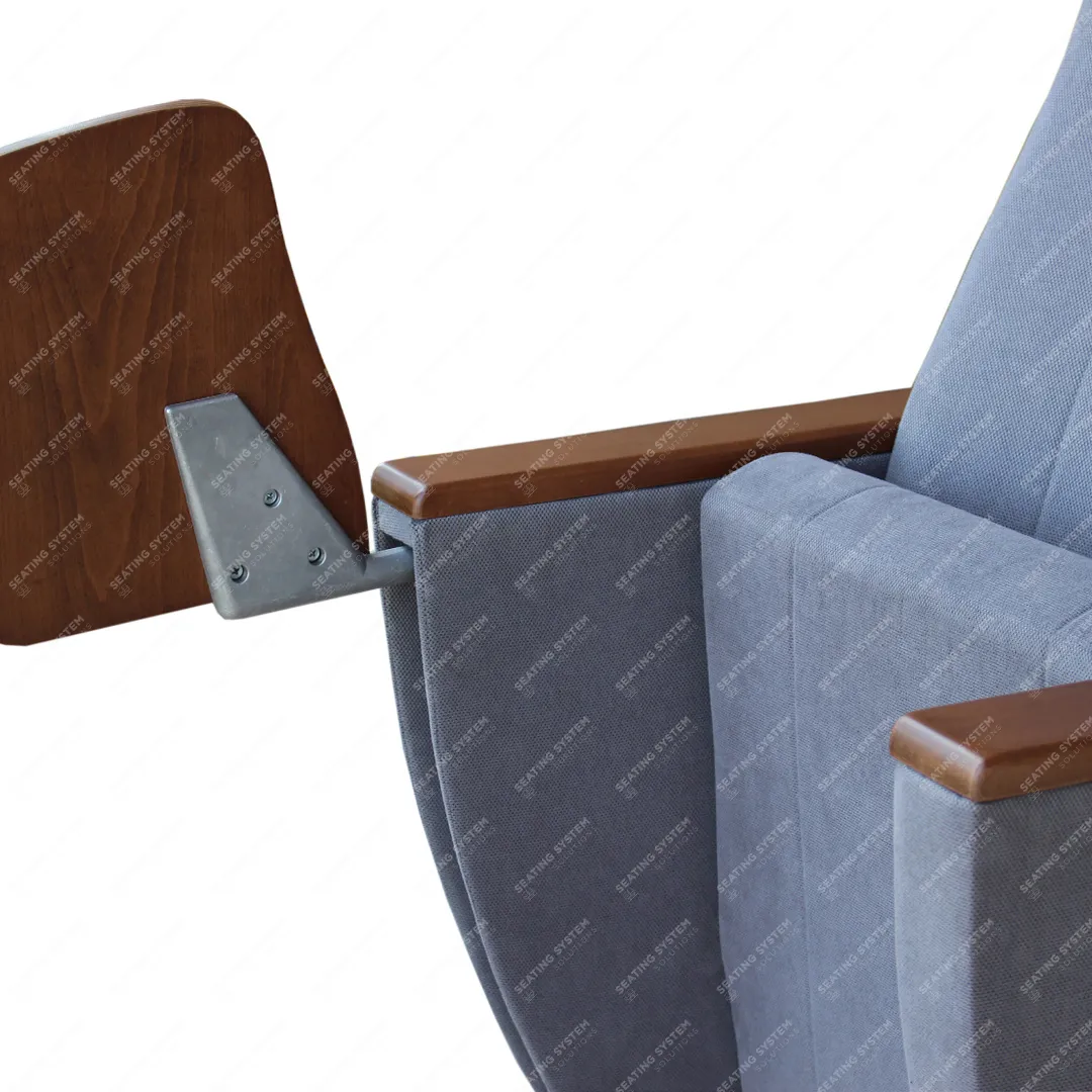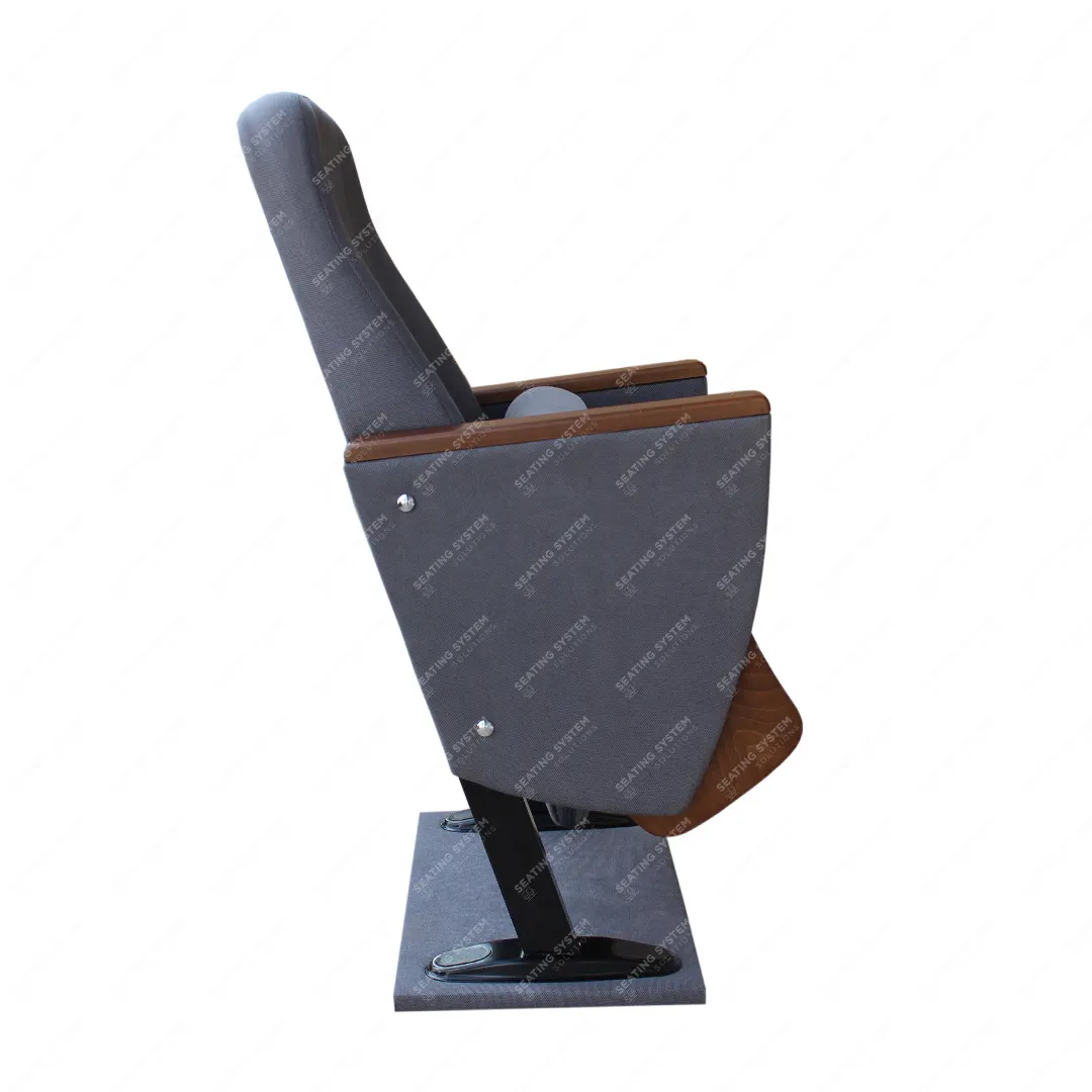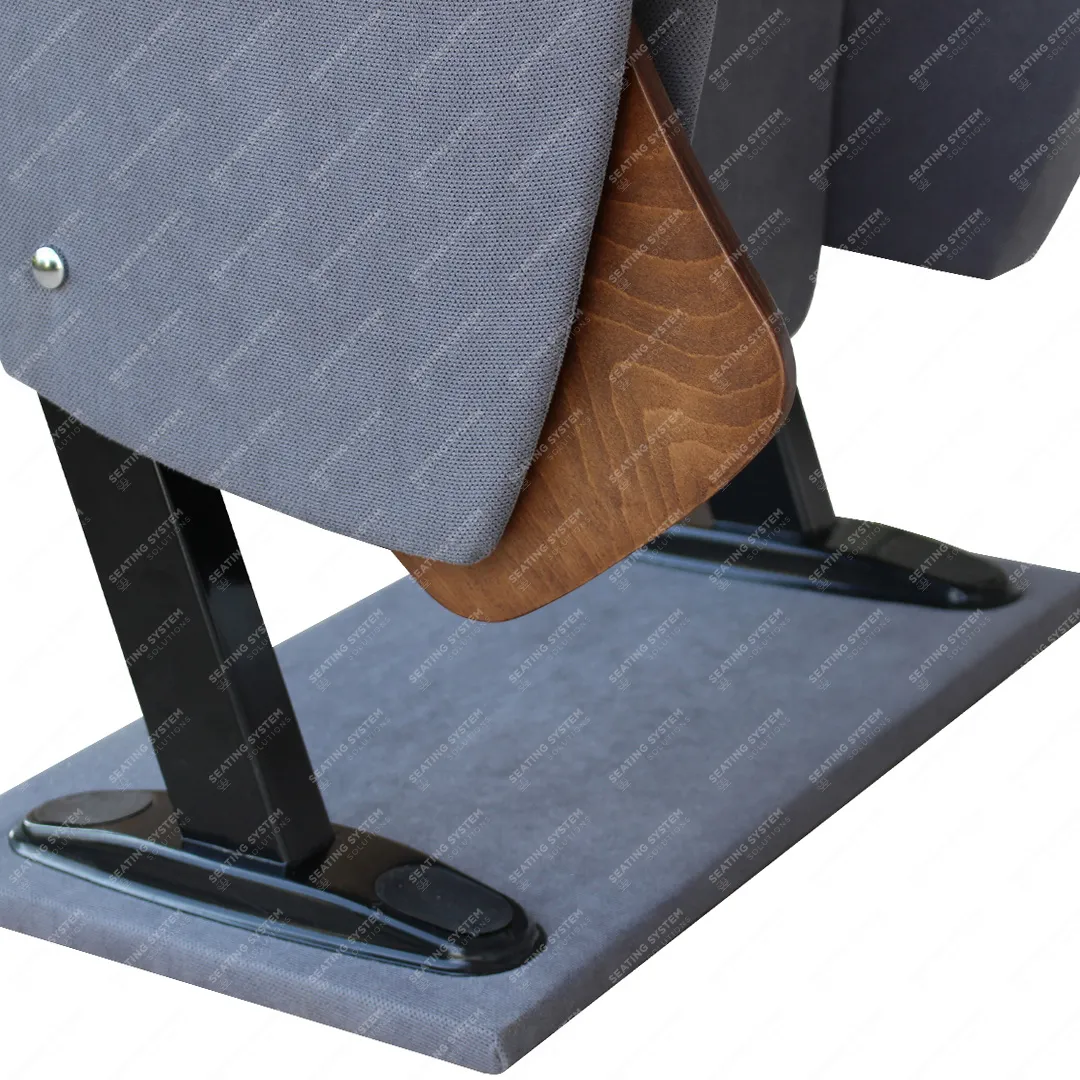 The foot connection parts are manufactured from 40x60x1,5mm profile and the connection parts to the floor are made of at least 2 mm sheet which is shaped and formed by molds. Metal frame under armrest are covered with mdf and laminated fabric. Wooden armrests and anti panic writing table are fix on the metal frame. Armrests between the seats are used as a common. The seats are fixed to the floor with double legs and suitable fasteners.