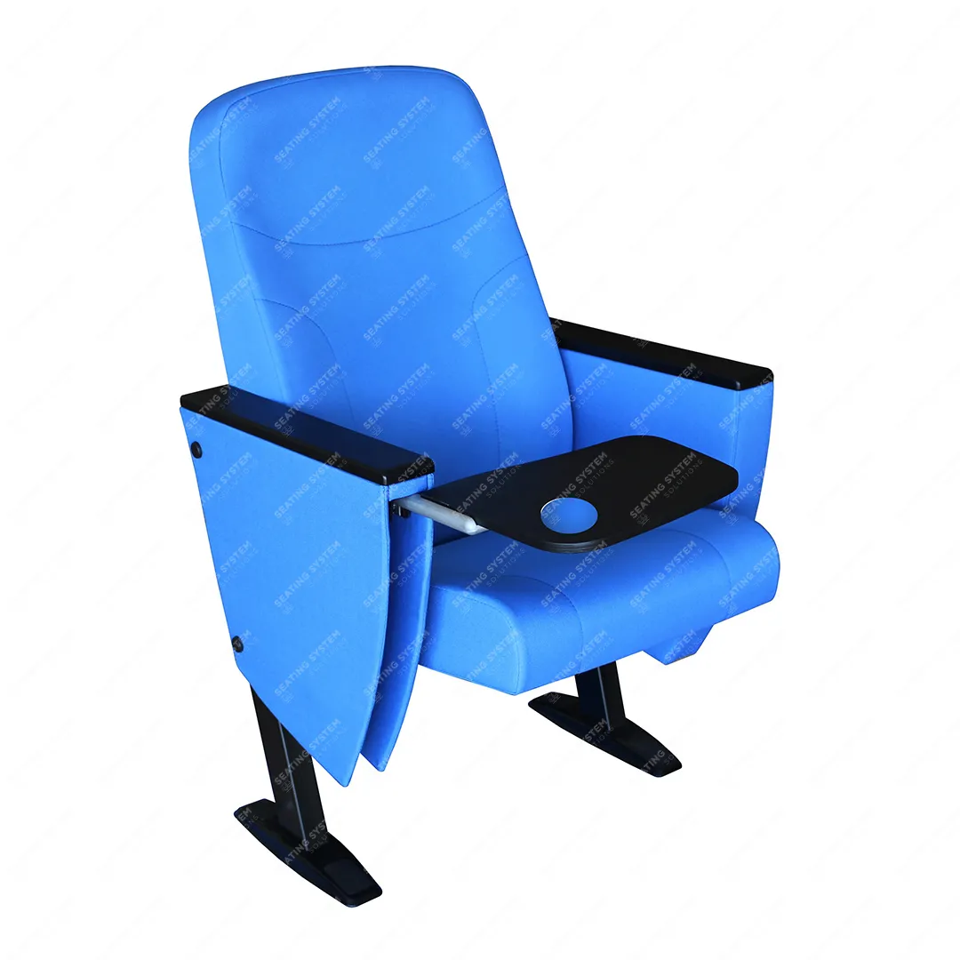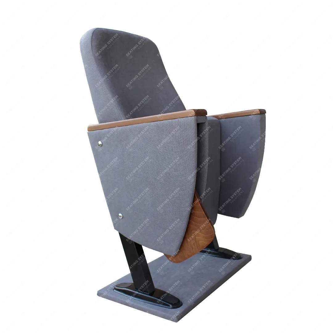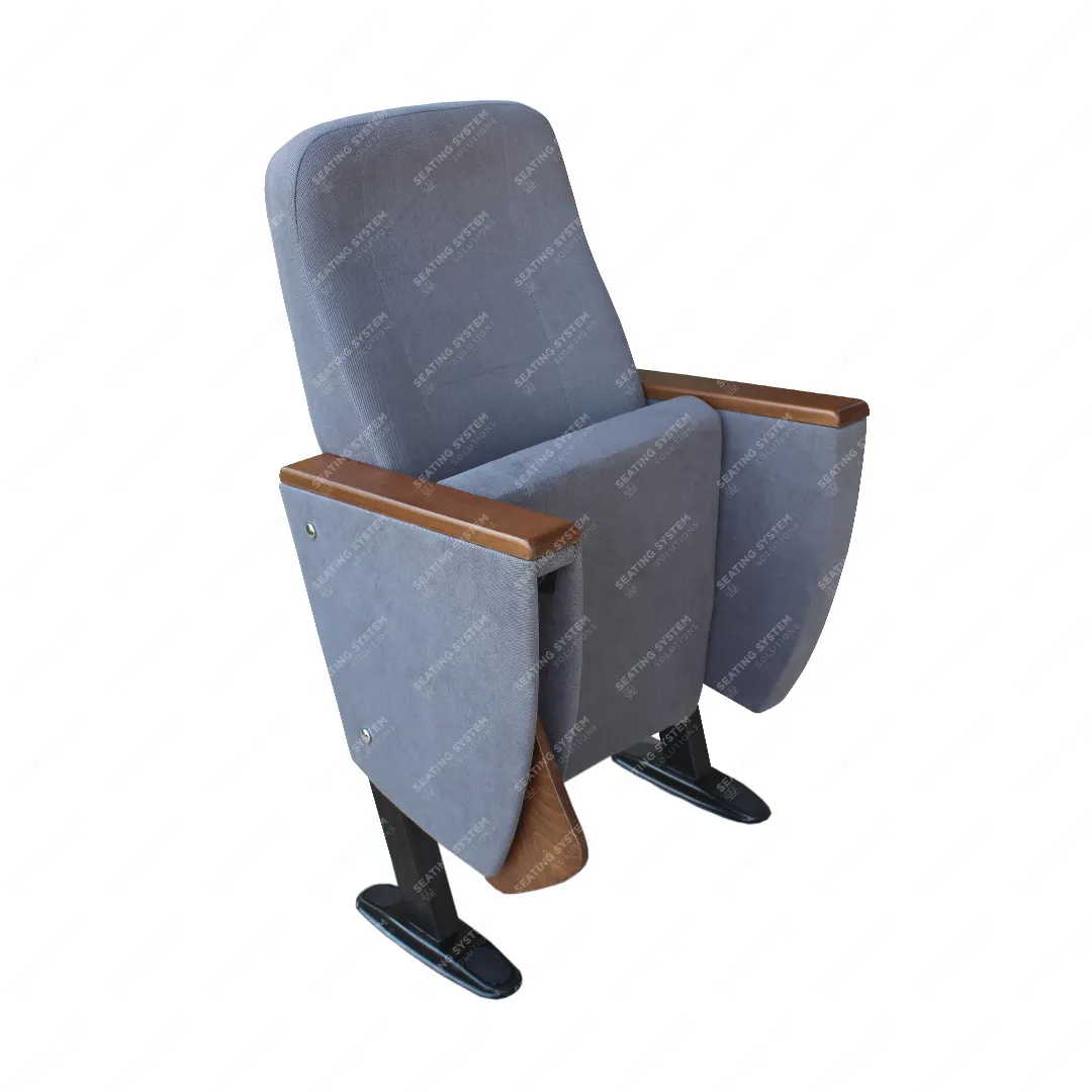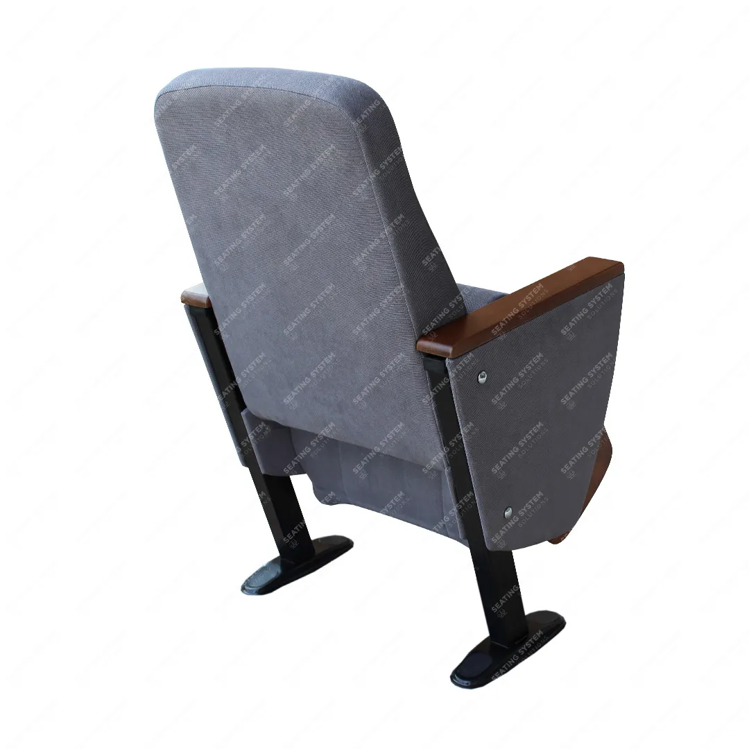 The foot connection parts are manufactured from 40x60x1,5mm profile and the connection parts to the floor are made of at least 2 mm sheet which is shaped and formed by molds. Metal frame under armrest are covered with mdf and laminated fabric. Wooden armrests and anti panic writing table are fix on the metal frame. Armrests between the seats are used as a common. The seats are fixed to the floor with double legs and suitable fasteners.