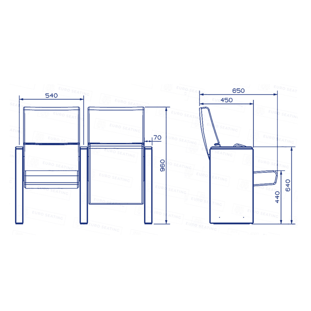 The legs are made of 18 mm mdf material and covered with laminated fabric The armrest is made of polished wooden from beech material. The Armrests between the seats that are installated in sequentially are used in common. Armrests between the seats are used as a common. The connection parts of the seats to the floor are made of 6 mm thick metal part. The seats are fixed to the floor with double legs and suitable fasteners.