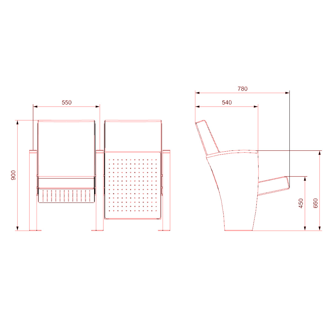 The legs of the seats are made of 18 mm thick MDF beech coated material, by joining the joints at an angle of 45 degrees. Polished wooden armrests made of beech material are mounted on the armrests. The armrests between the rows of seats are used in common. The connection parts of the seats to the floor are made of 6 mm thick sheet metal. The seats are fixed to the floor with suitable fasteners as double legs.