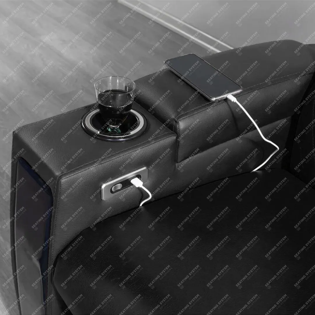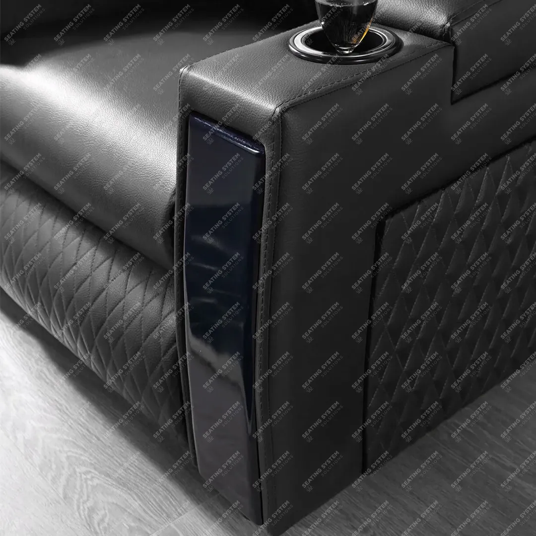 It can be placed one after the other in collective use. It is used as a home cinema chair in home cinemas and shared viewing rooms. There are cup holders on the arms of the chair. There are wooden sections on the arms.